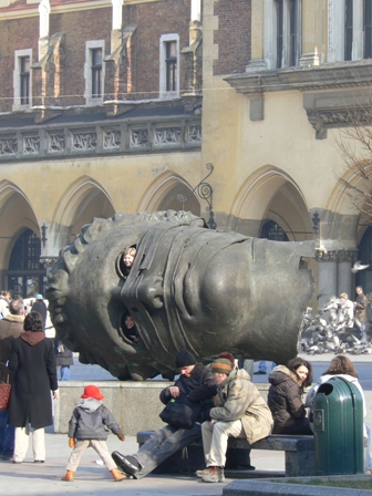 Wkleję Wam rzeźbę zaraz z oddali, żebyście zobaczyły jak wygląda i co z nią wyrabiają dzieci. Danusiu twarz patrzy, a raczej jest zwrócona ku kamieniczkom pomiędzy ul. ¦w. Anny i Szewską, jest dość blisko Sukiennic. Będzie widać na zdjęciu.