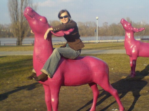 Bardzo lubię te różowe jelonki (na zdjęciu jeden, bo na innych siedzieli ludzie). W tle za Wisłą katedra praska.